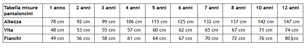 Taglie Pantaloncini bambino