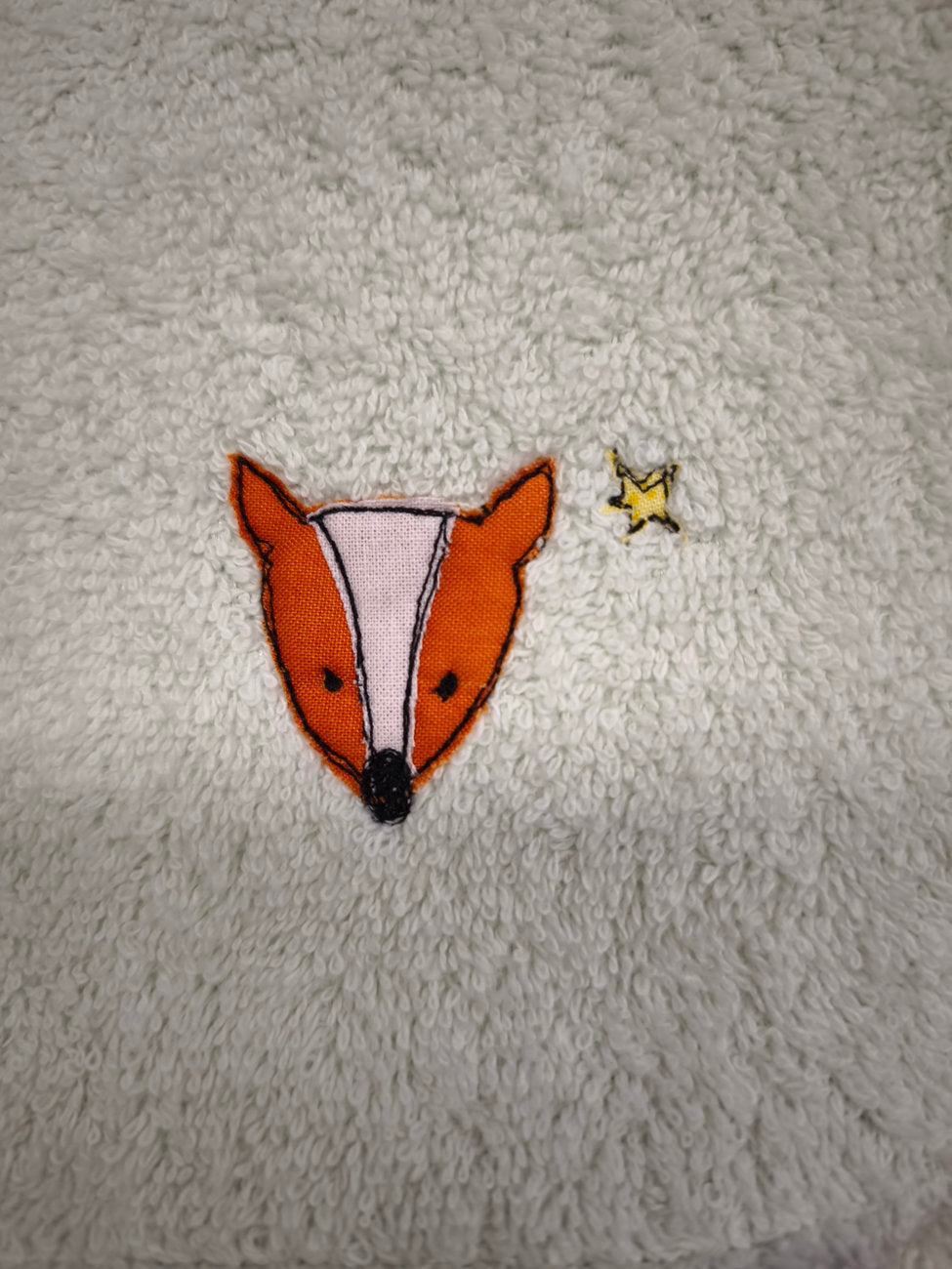 Realizzato a mano, è double face: da un lato morbida spugna bianca con la testolina della volpina, dall’altro un romantico tessuto verde salvia, molto delicato, quasi grigio, con fantasia di bacchette magiche (grafiche NotOnlyTeddy).