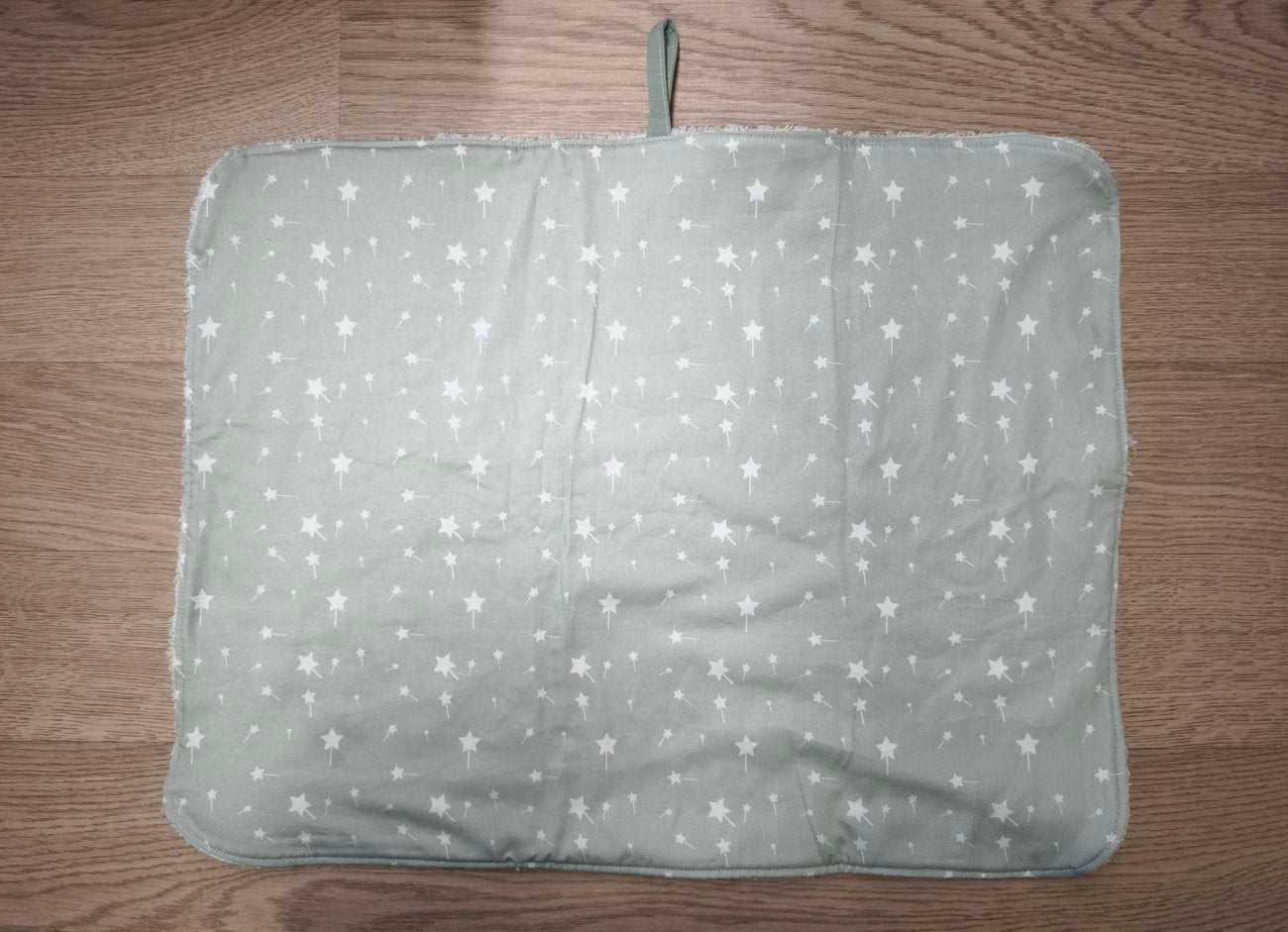 👶 A metà del lato lungo un'asoletta in tessuto verde salvia, per appenderlo comodamente all'asilo, nell'armadietto o nel bagno.