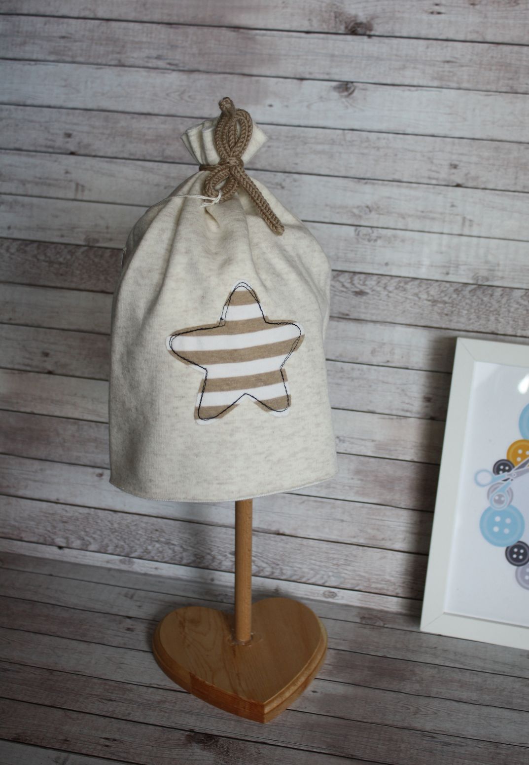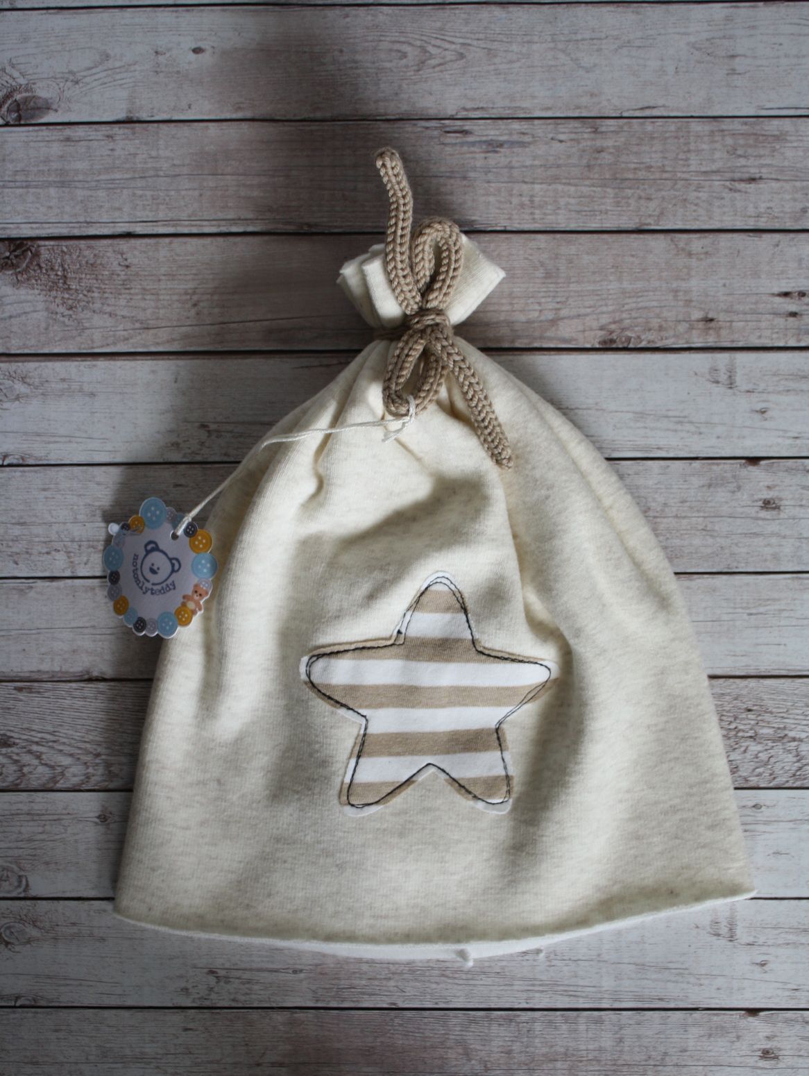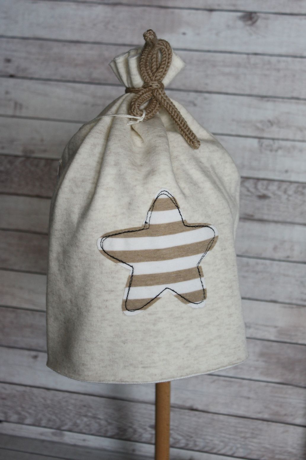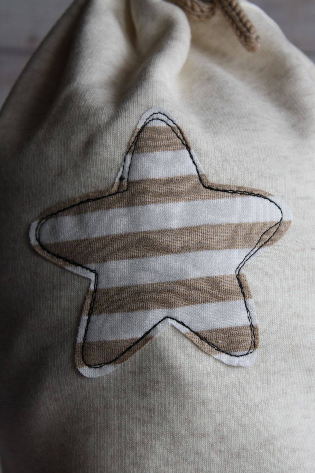 Davanti una stella in maglina a righe bianche e beige profilato con cucitura nera.