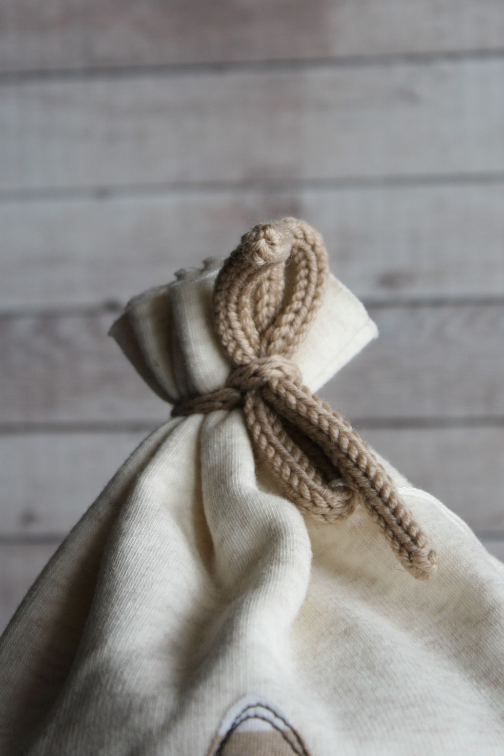 In cima la felpa è raccolta con un fiocchetto in lana lavorata a tricotin (vedi foto).