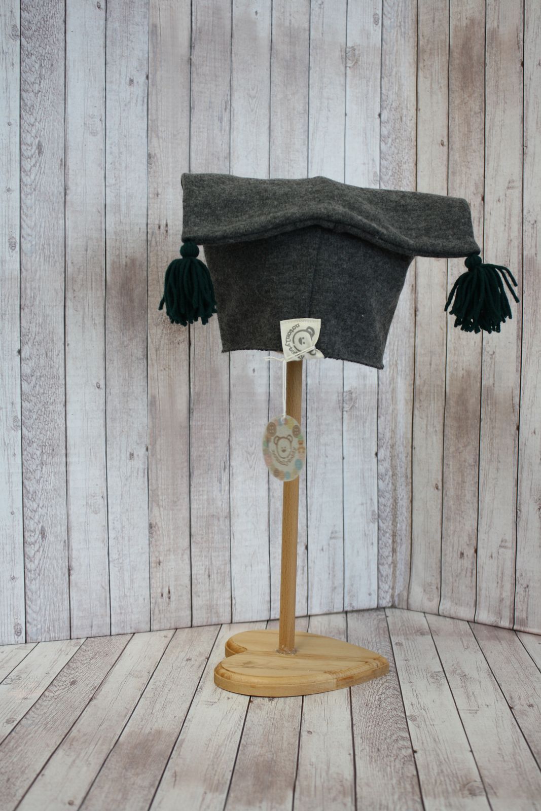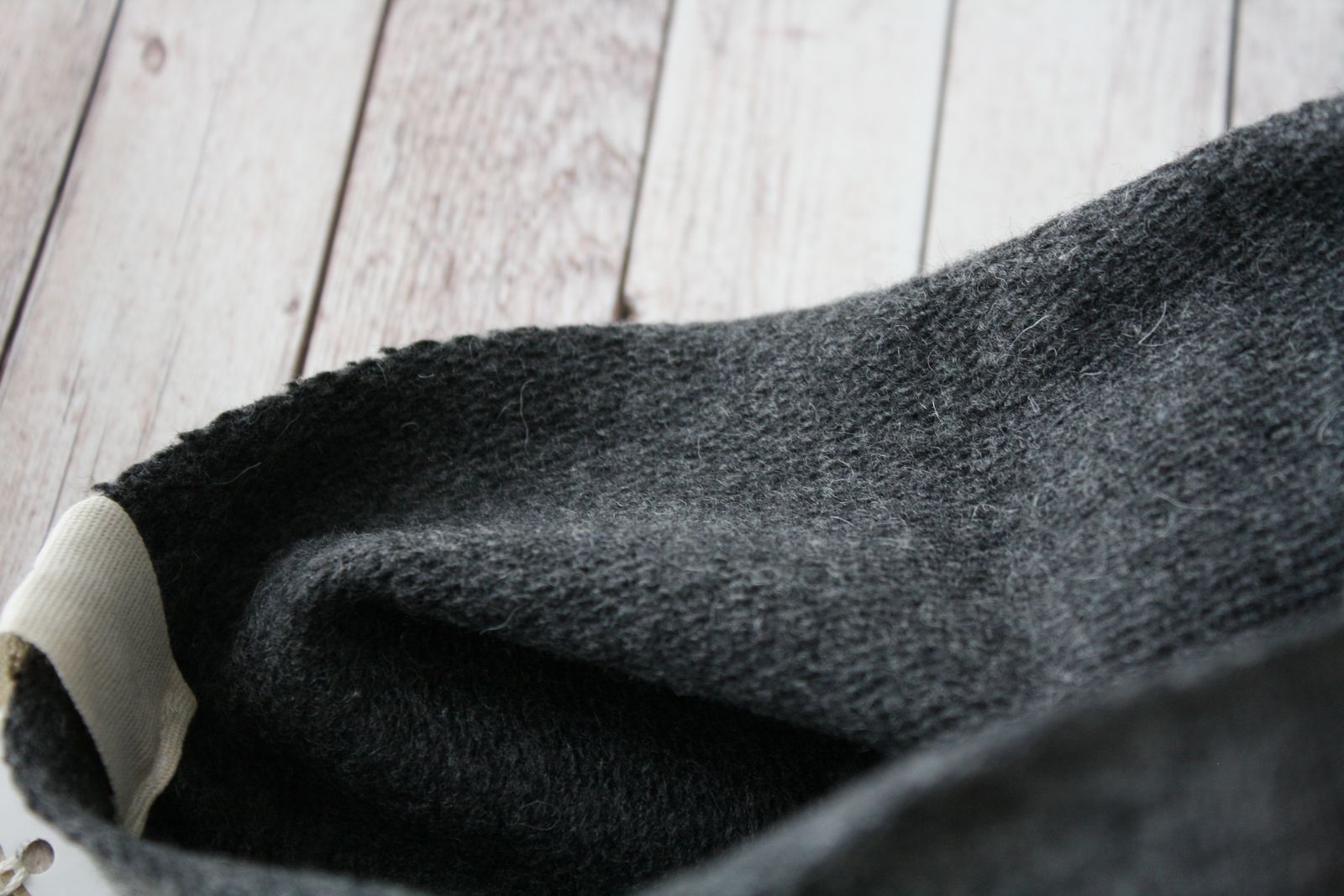 Berretto rettangolare in maglina di lana di media pesantezza grigio scuro (al tatto sembra lana cotta ma più elastica) con cucitura sul retro e bordi tagliati "a vivo".