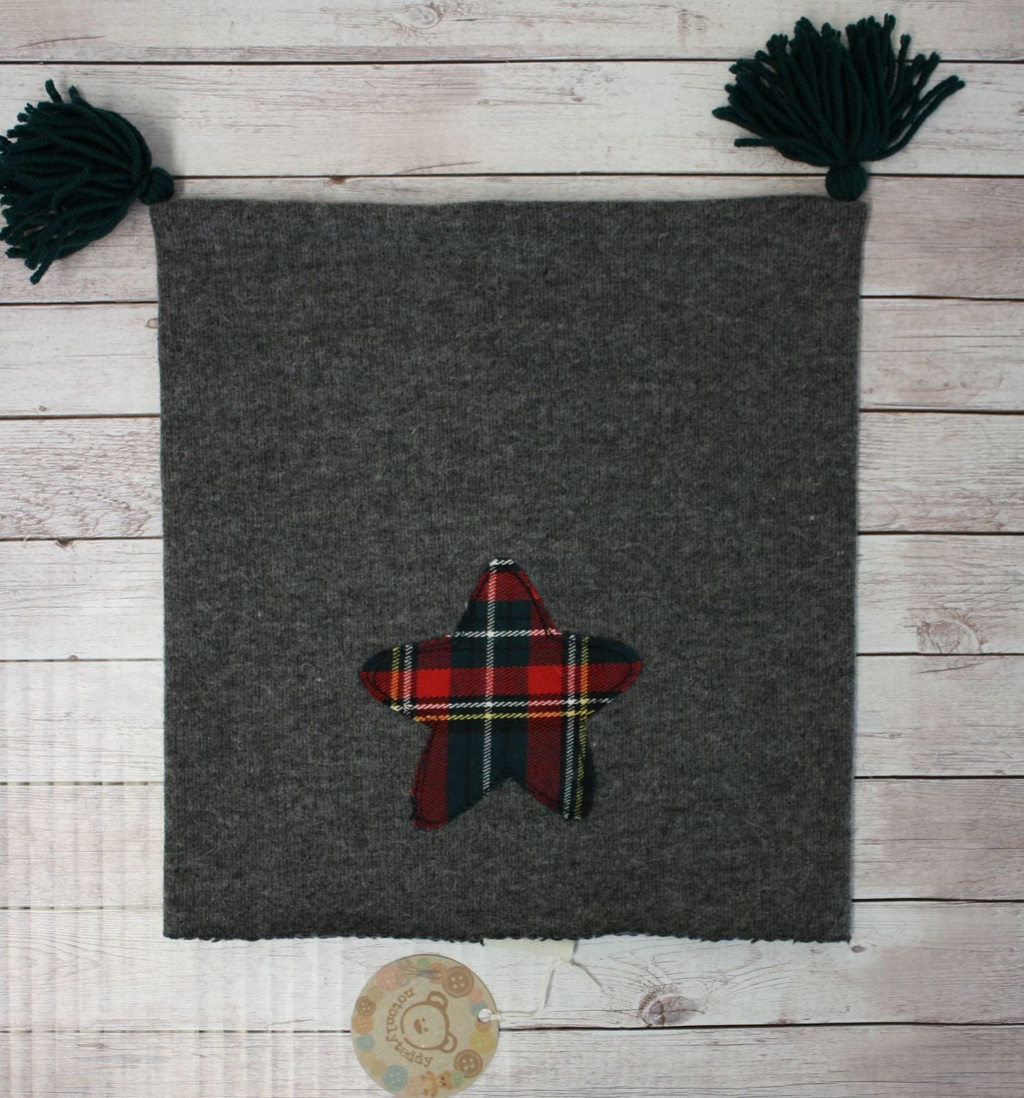 Berretto in lana grigia con nappine verdi - stellina scozzese - 3-5 anni