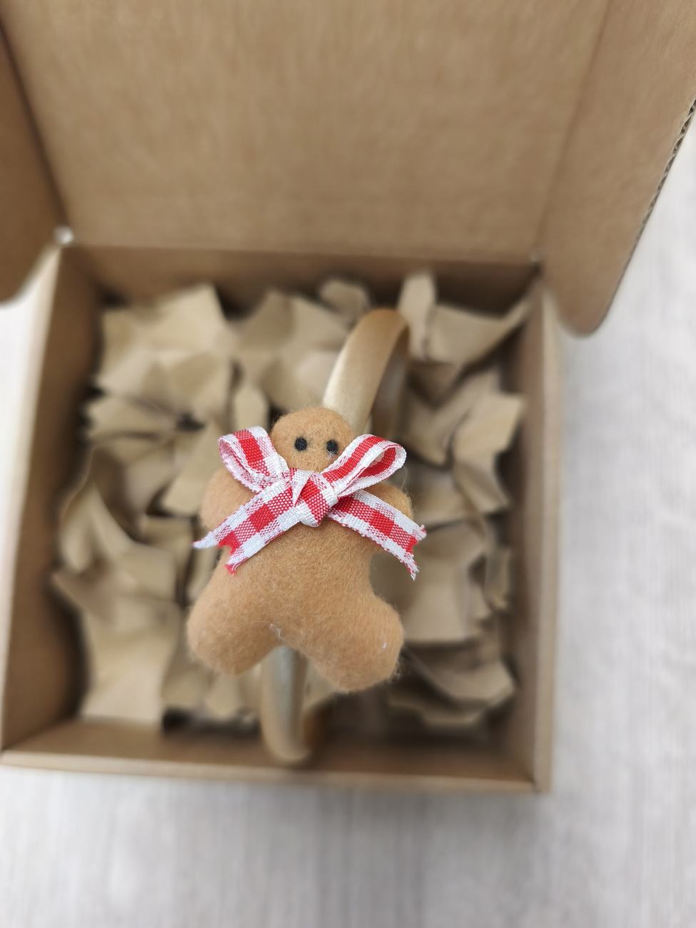 Il biscottino di pan di zenzero è cucito e decorato: panno color biscotto, sagomato, cucito, imbottito con poliestere e decorato con colla a caldo.