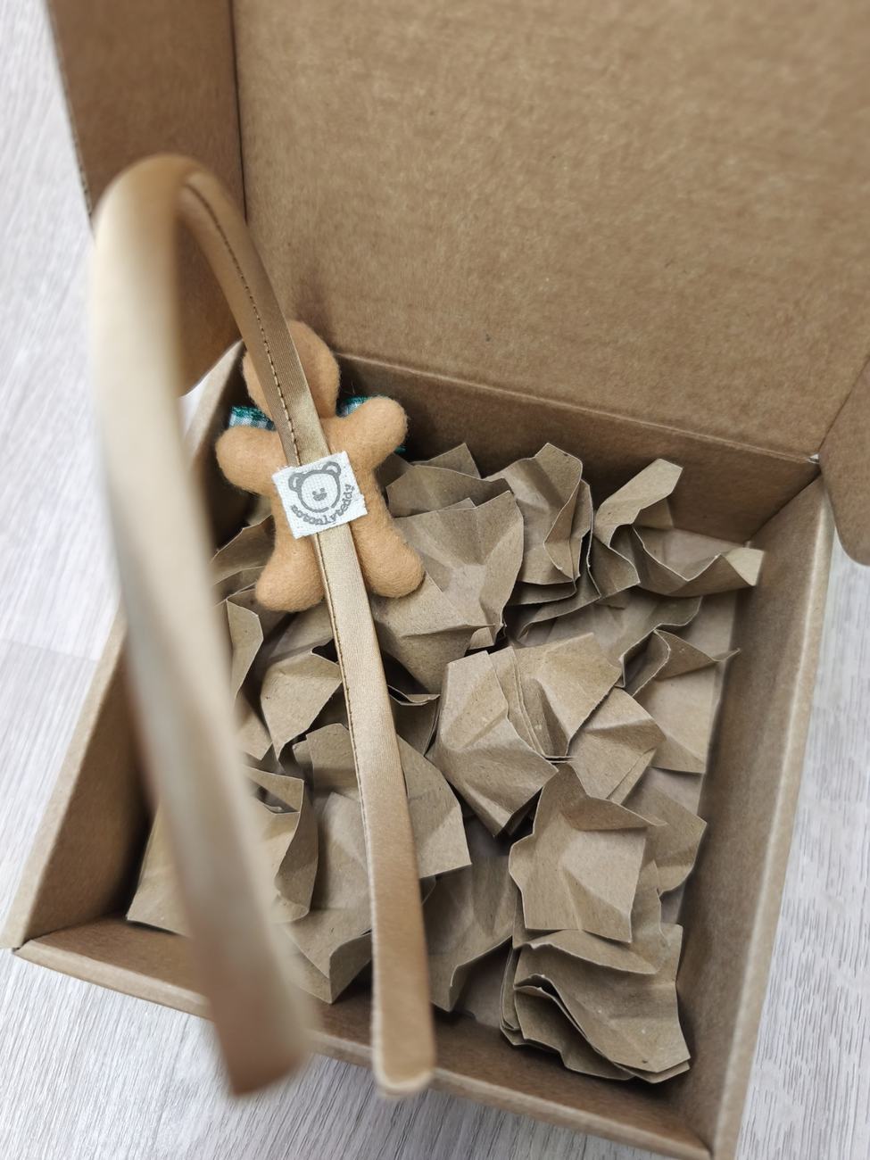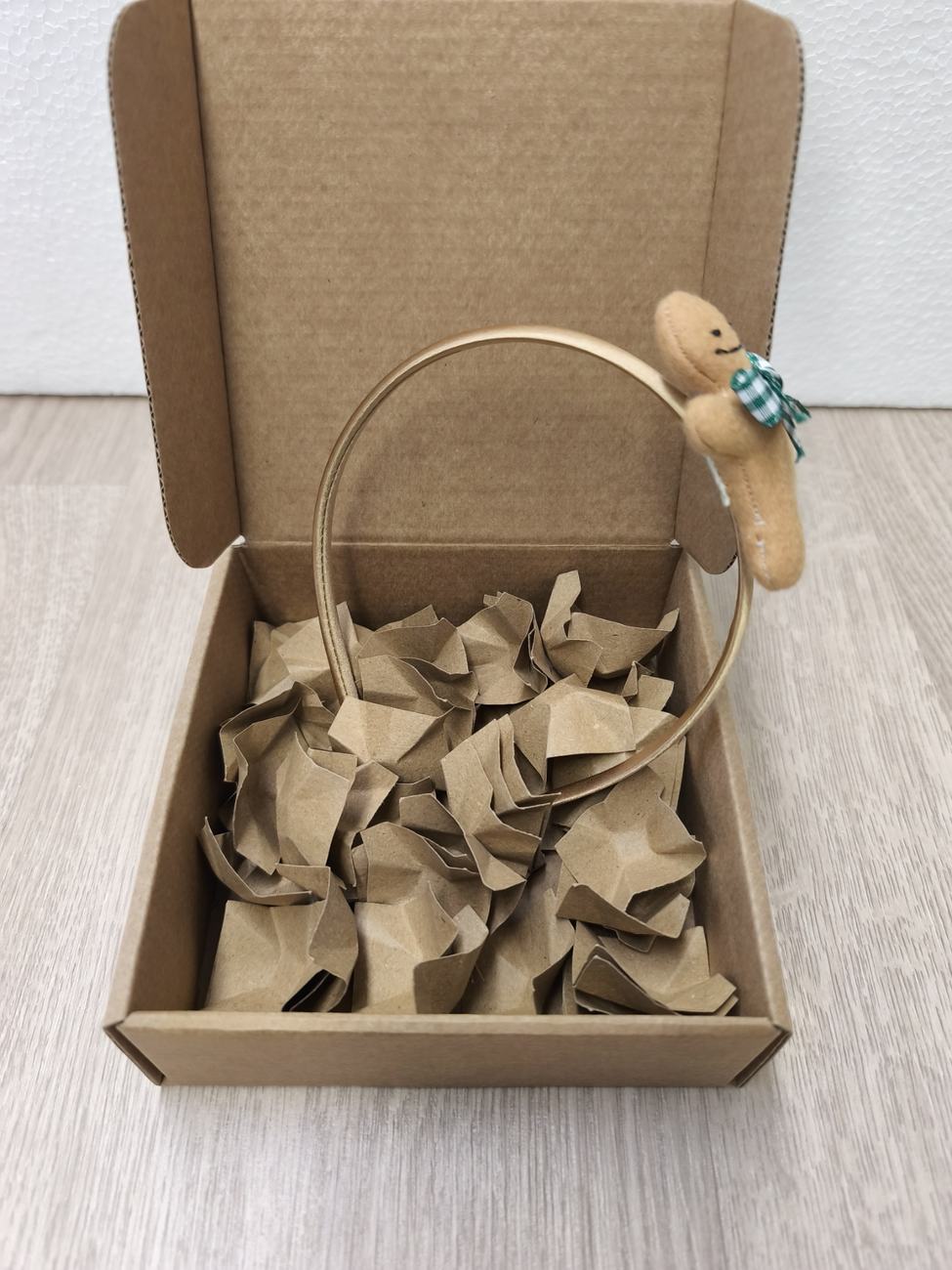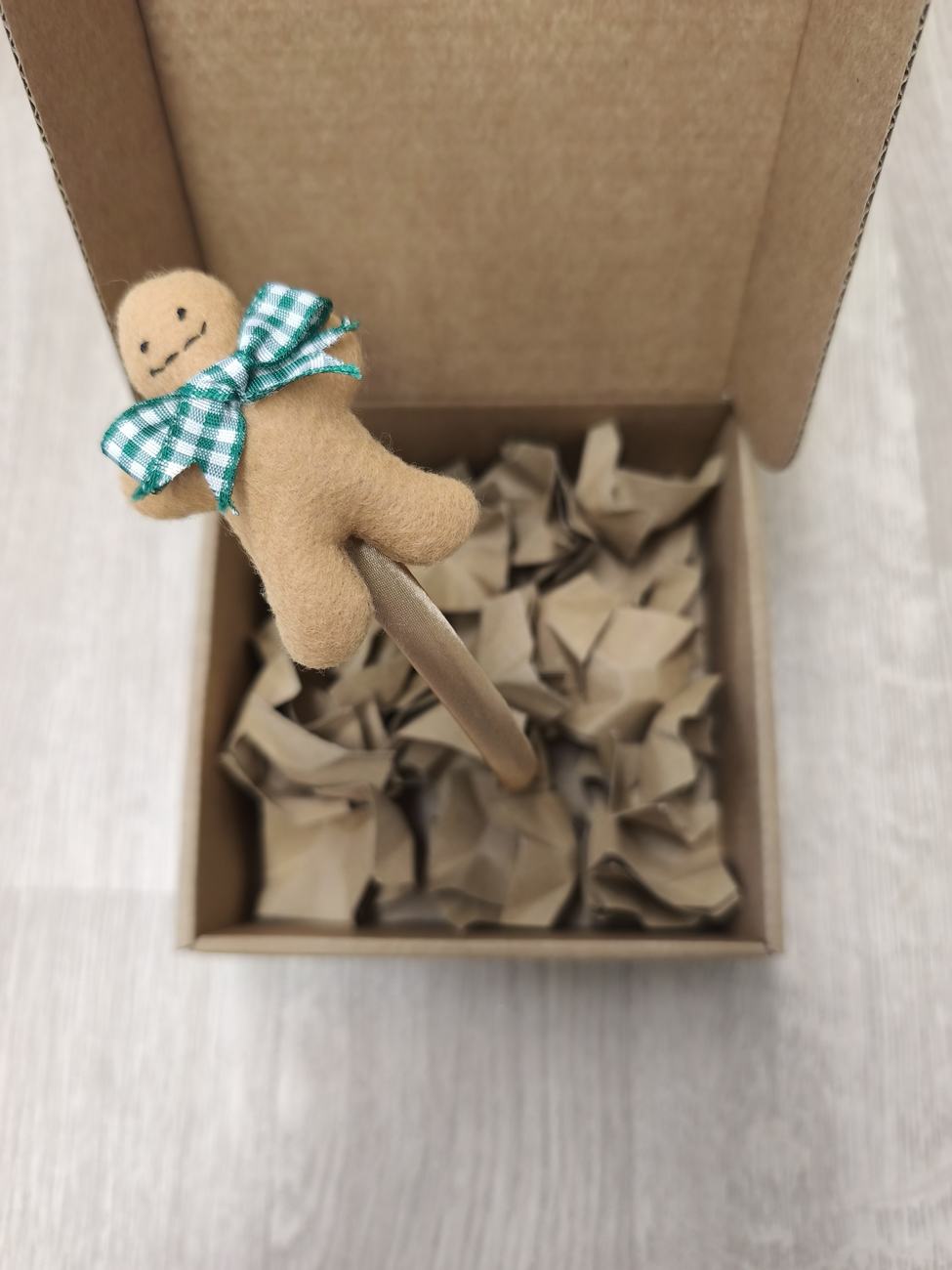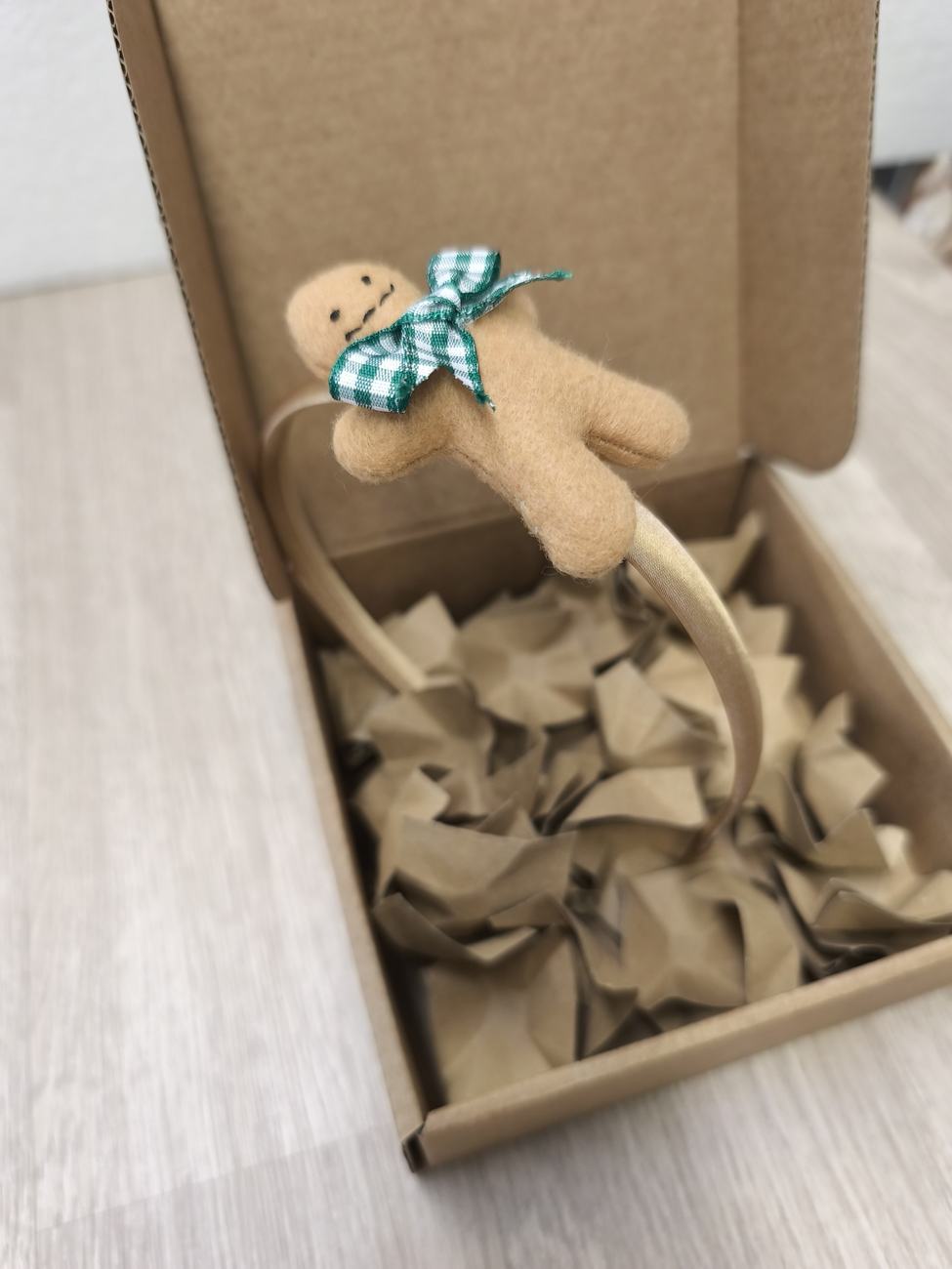 Il biscottino di pan di zenzero è cucito e decorato: panno color biscotto, sagomato, cucito, imbottito con poliestere e decorato con colla a caldo.