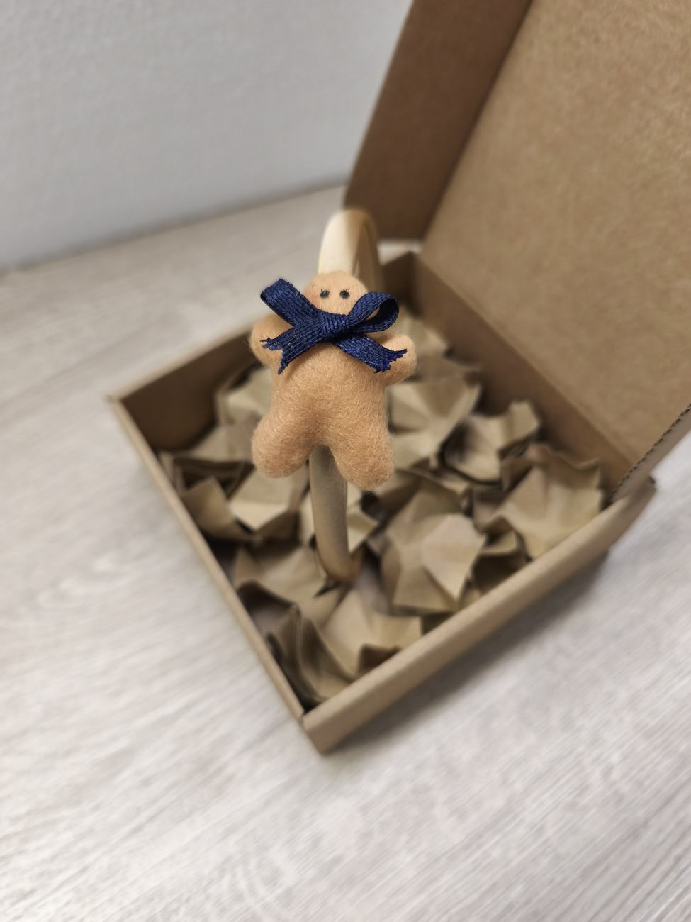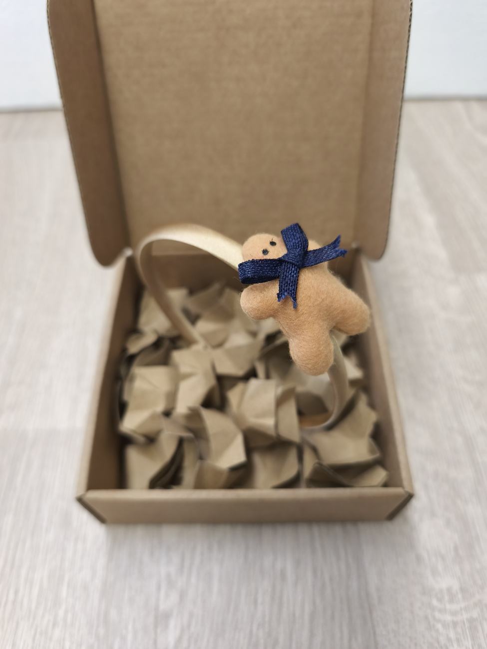 Il biscottino di pan di zenzero è cucito e decorato: panno color biscotto, sagomato, cucito, imbottito con poliestere e decorato con colla a caldo.