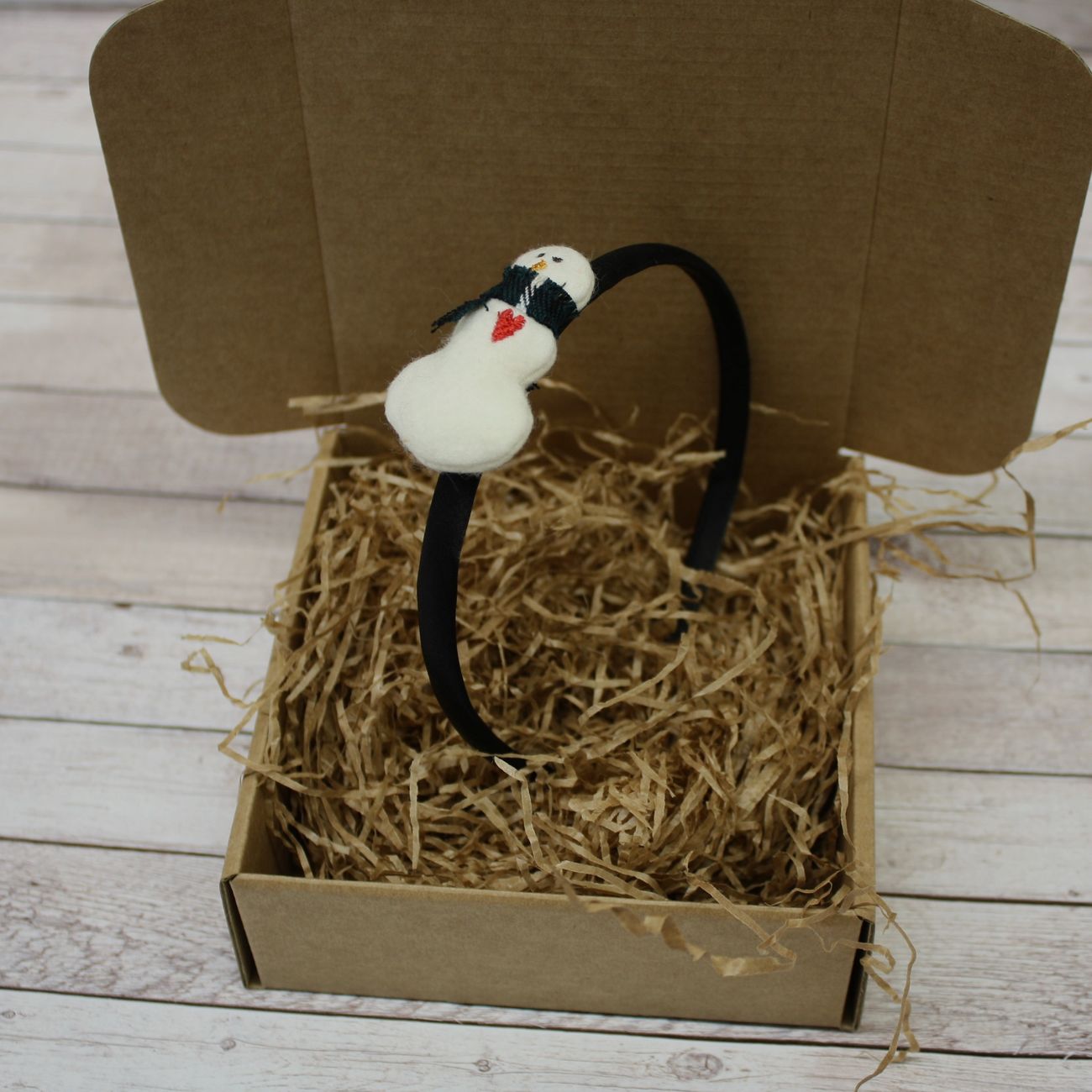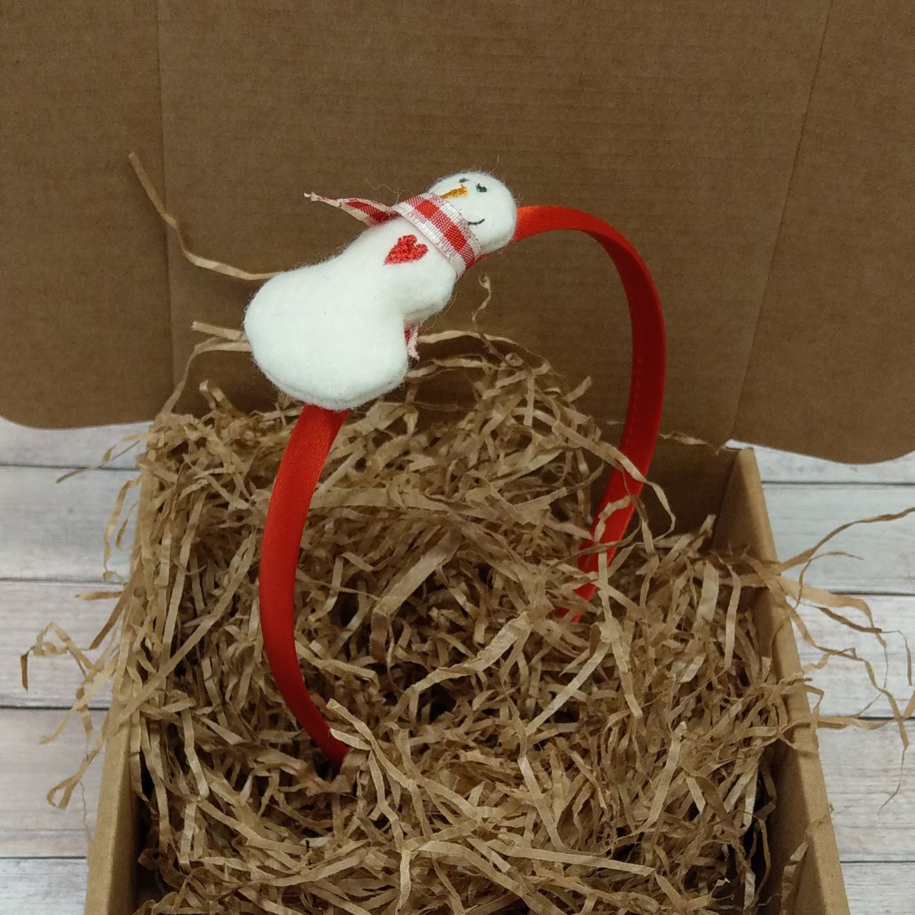 Il pupazzo di neve è cucito e ricamato: panno bianco ricamato, sagomato, cucito e imbottito con poliestere. Il pupazzo successivamente viene incollato con colla a caldo e nuovamente cucito al cerchiello in modo che non rischi di staccarsi.