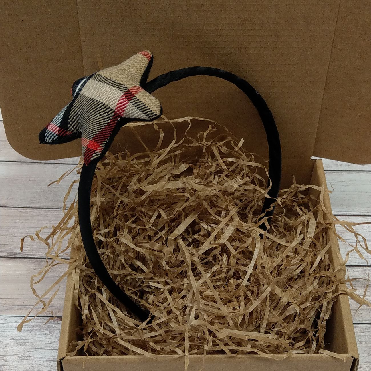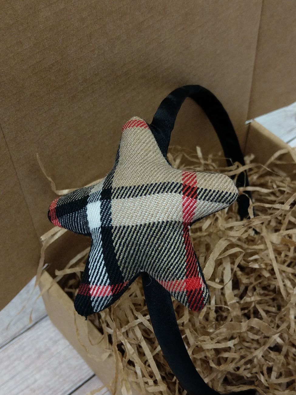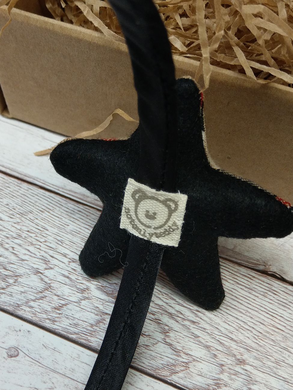 La stellina è fatta a mano: tessuto scozzese beige, nero, rosso e bianco e panno nero, cuciti e imbottiti con poliestere. La stellina successivamente viene incollata con colla a caldo e nuovamente cucito al cerchiello in modo che non rischi di staccarsi.