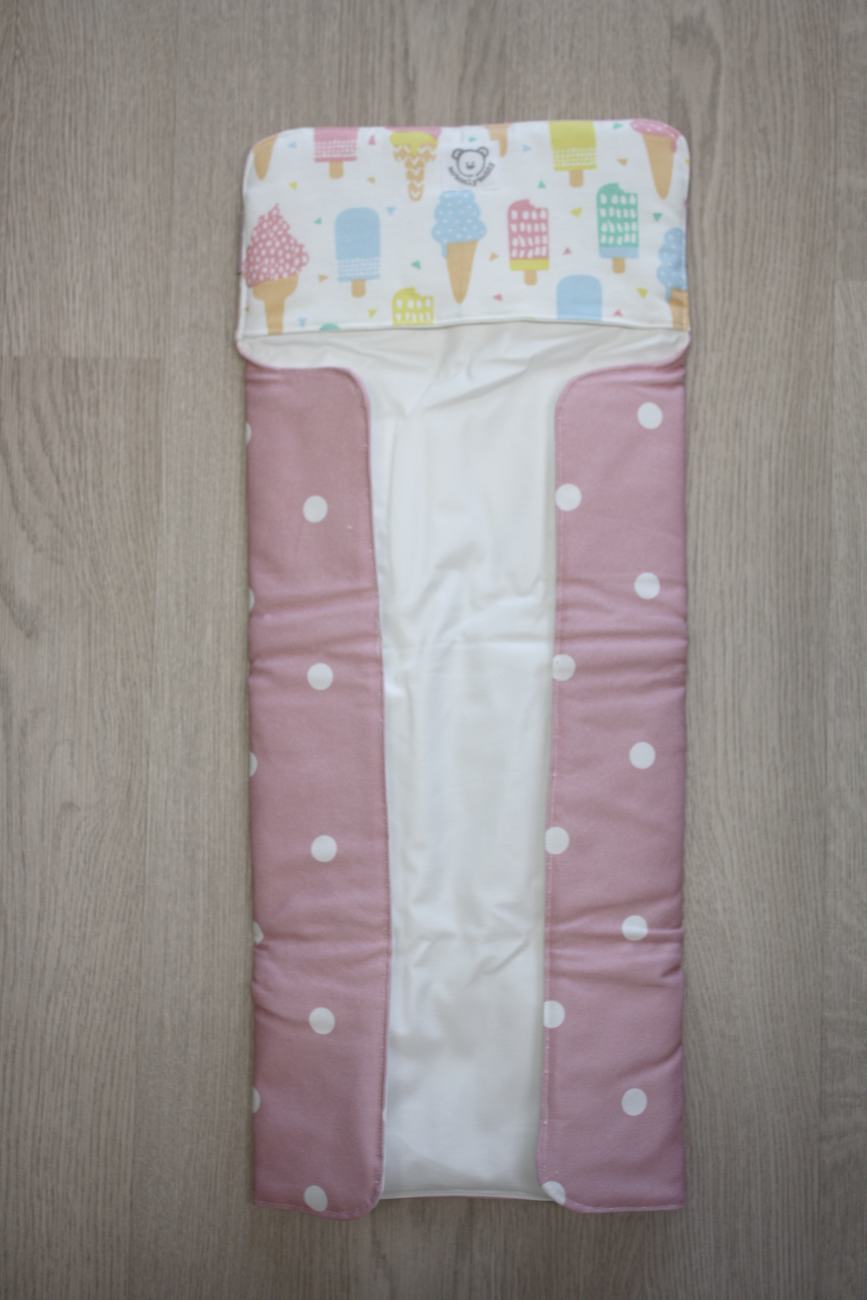 Realizzato a mano con cura, ha un'estetica dolce con pois bianchi su sfondo rosa. Nella parte della tasca una simpatica stoffa a fantasia di gelati.