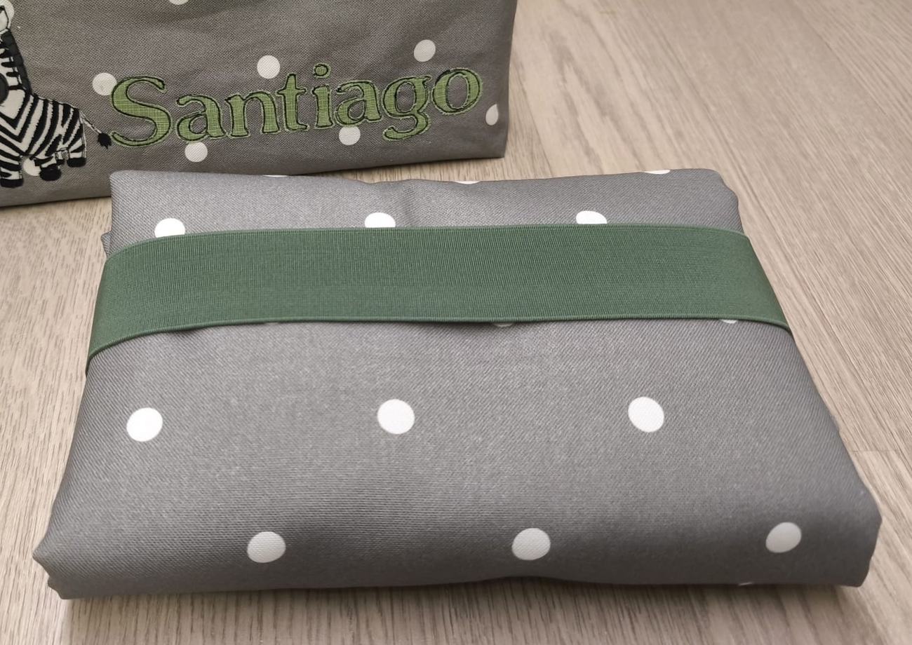Esterno in tessuto spesso di cotone grigio a pois bianchi. Leggermente imbottito (poliestere) per poter cambiare il tuo bimbo ovunque ti trovi.