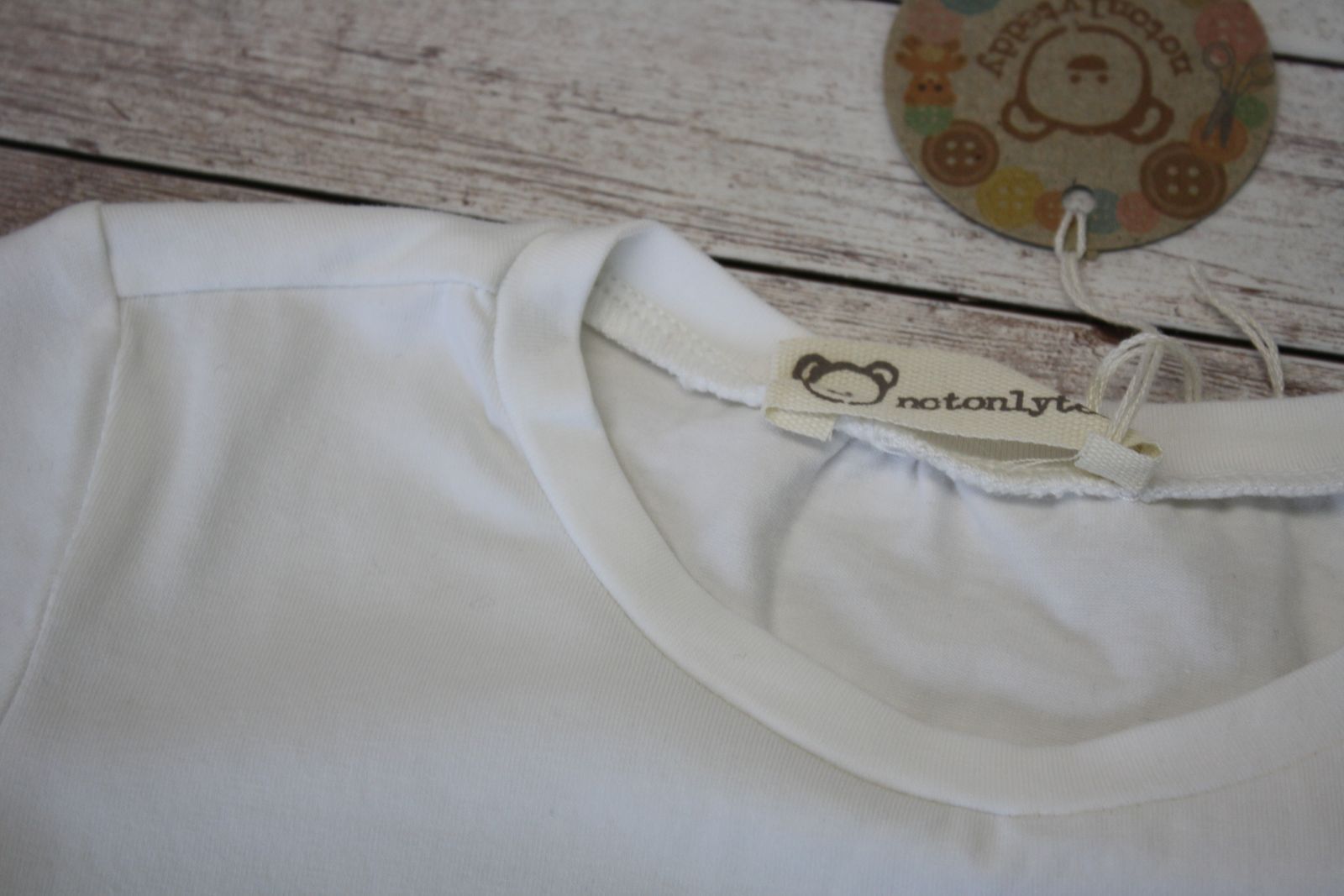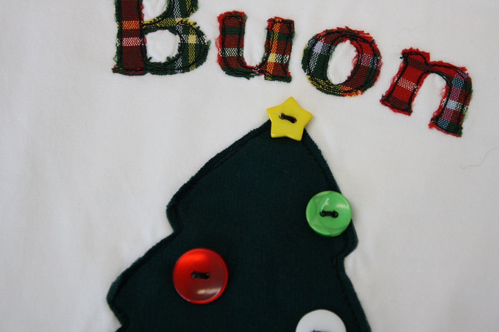T-shirt artigianale a maniche lunghe, con applicazione di alberello di Natale e scritta "Buon Natale" in stoffa, profilati poi a macchina a mano libera con filo nero.
