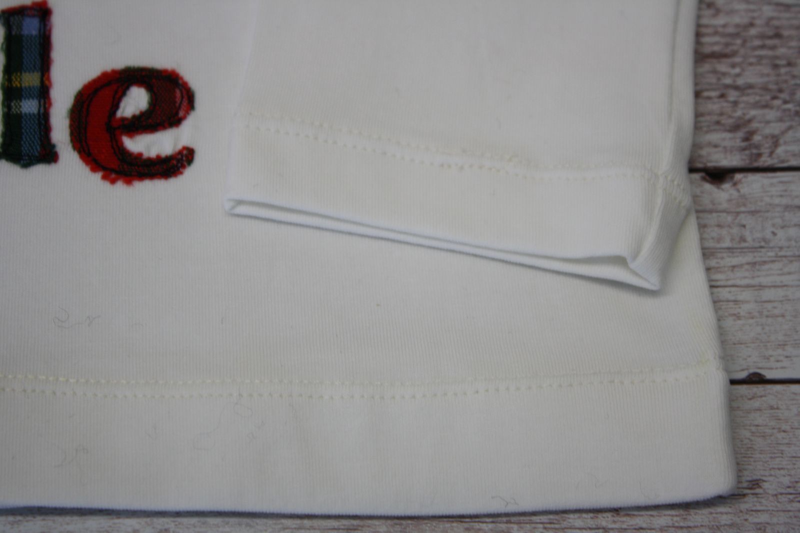 Applicazione di alberello di Natale e scritta "Buon Natale" in stoffa, profilati poi a macchina a mano libera con filo nero.