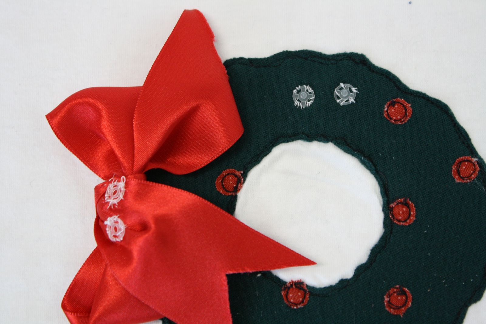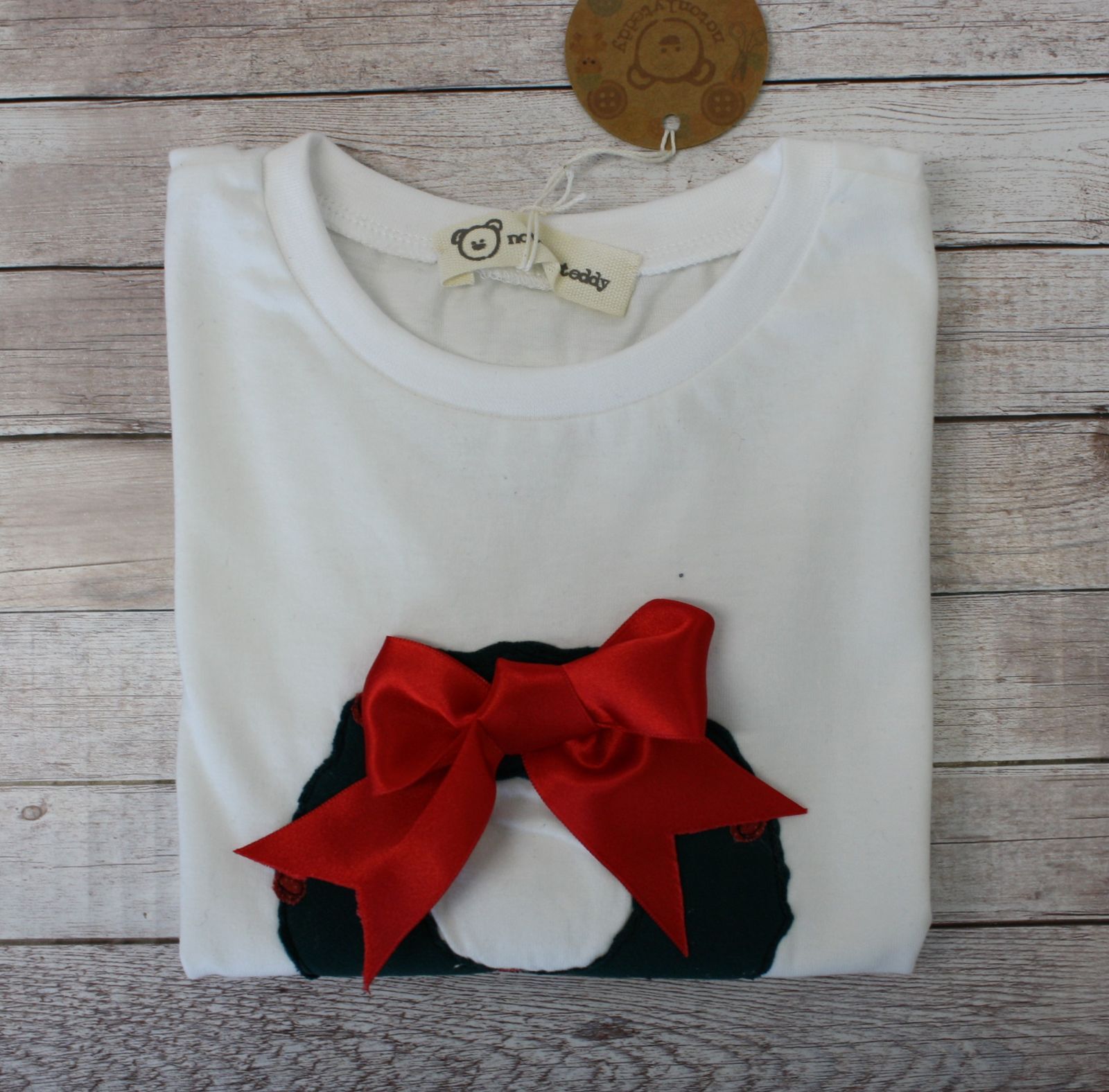 T-shirt artigianale a maniche lunghe , con applicazione di ghirlanda verde in felpa, profilata poi a macchina a mano libera con filo nero e decorato con fiocco in raso.