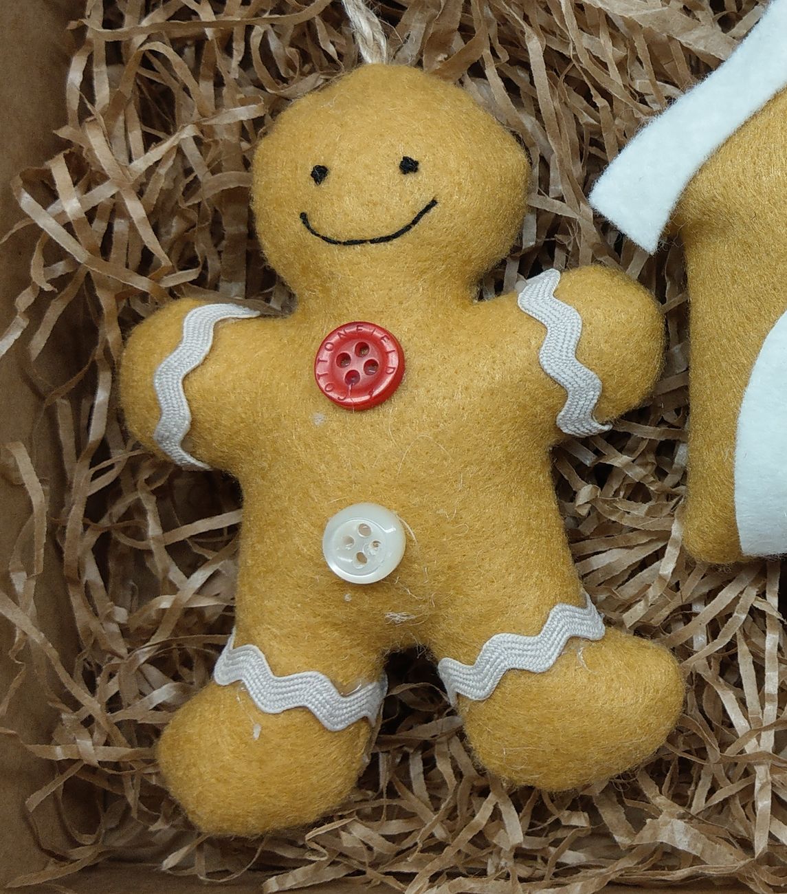 Si tratta di biscottini di pan di zenzero: disponibili in versione maschietto o femminuccia e in versione casetta; cuciti, imbottiti e decorati con panno, nastri e passamaneria con un nastrino per appenderli