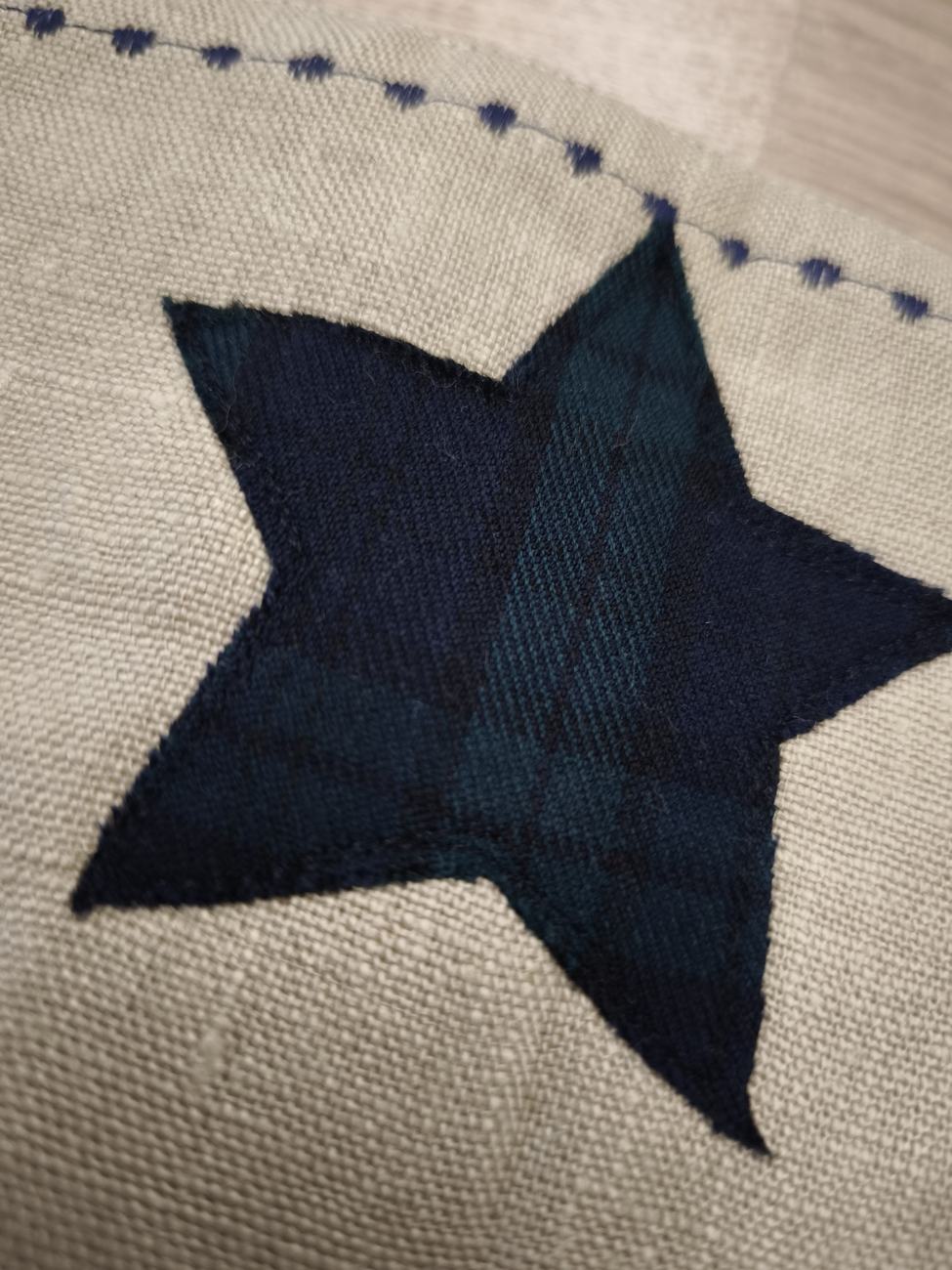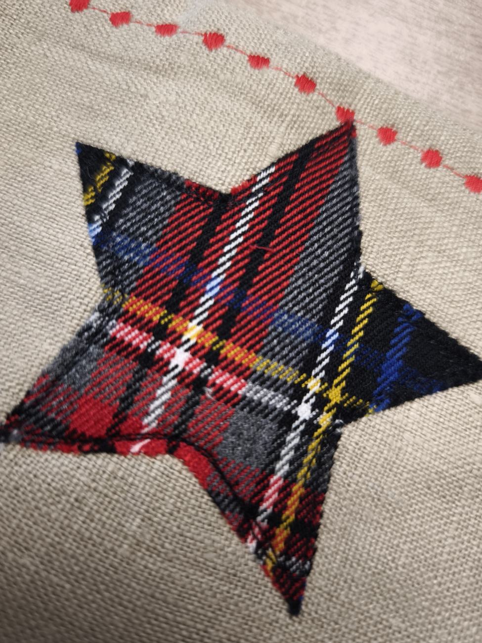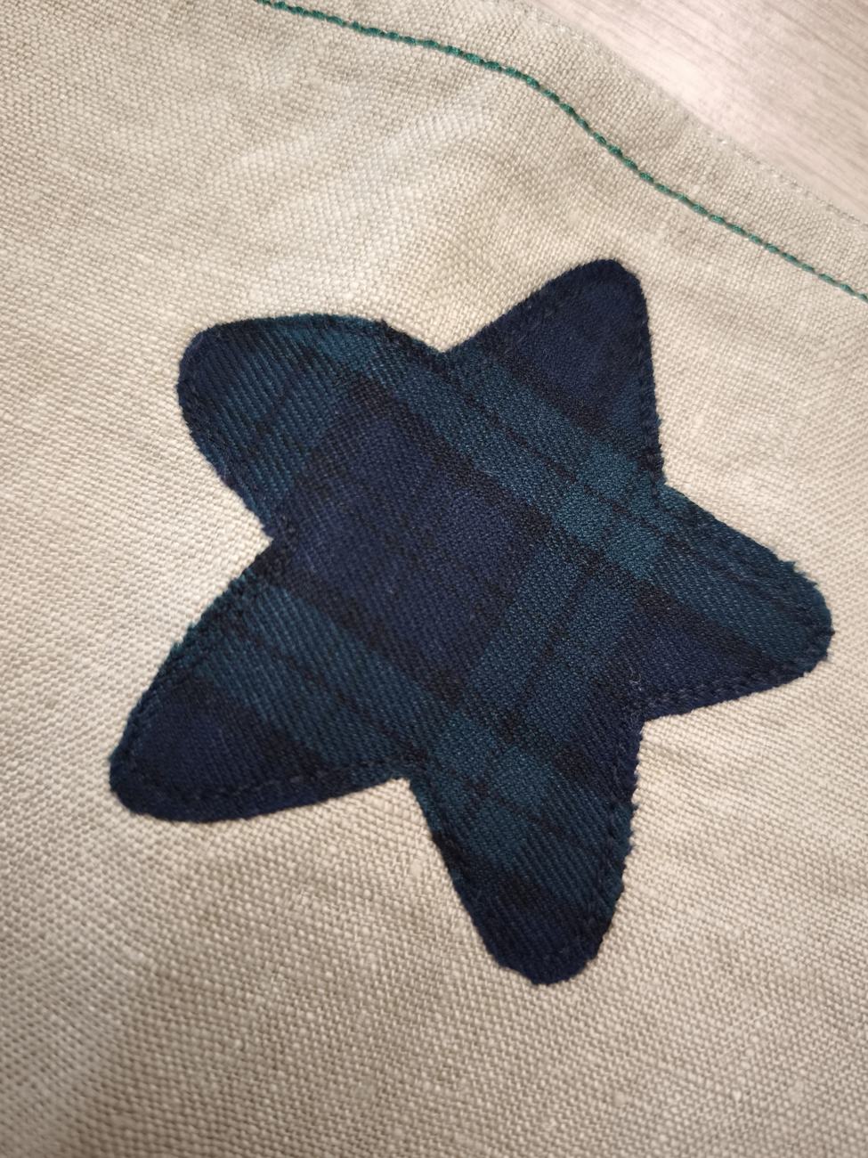 Ricamo eseguito con applicazione di pezzettini di tessuto a formare la decorazione e profilato con tecnica freemotion.